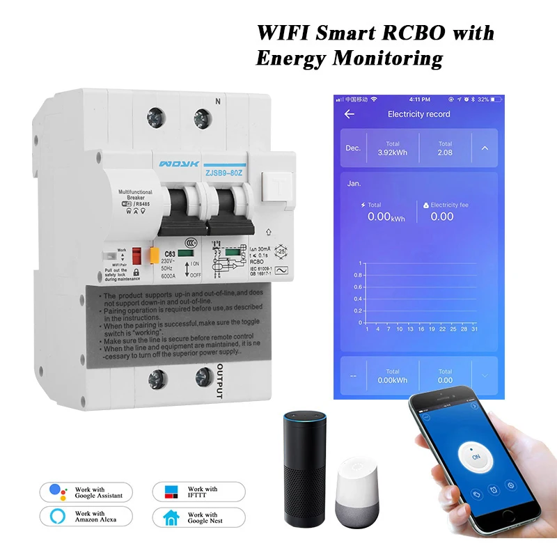Get WIFI Smart RCBO residual current circuit breaker with Energy Monitoring compatible with Alexa Googl
